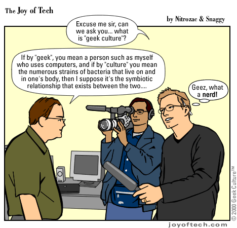 Welcome to the Joy of Tech... illustrated by Nitrozac and written by Nitrozac and Snaggy. It's a little bit simpler in style than our other comic After Y2K, and a little more topical. We hope you enJoy!