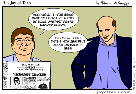 Welcome to the Joy of Tech... illustrated by Nitrozac and written by Nitrozac and Snaggy. It's a little bit simpler in style than our other comic After Y2K, and a little more topical. We hope you enJoy!
